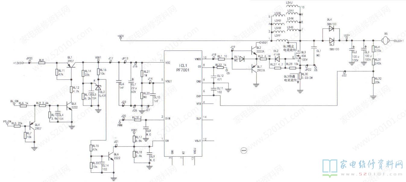 LED+1的背光驱动电压形成:二次开机主板正常工作后,输出高电平开待机控制信号(PS-ON),加至QL4的基极,由于QL4是PNP三极管,故处于截止状态,不影响相连电路QL5的工作状态。而输出的5V高电平背灯开关信号(BL-ON,单独维修电源板也可模拟接5V电压)加至QL5的基极,由于QL5是NPN三极管,故处于饱和导通状态。此时,电源板产生的12V供电,送至QL1的发射极,由于QL1是PNP三极管,加之QL5饱和导通,使QL1的基极电压强行拉低而导通,产生给背光驱动芯片ICL1(PF7001 )的11脚VCC供电,并且背灯开关信号还送给ICL1的使能控制①脚,其工作电压是由VDD1(VCC)通过分压而形成的。同时,由主板发出的PWM调光信号( 单独維修电源板也可模拟接3V电压)送至背光驱动芯片ICLI(PF7001)的②脚。外部条件全部满足后,背光驱动芯片ICLI(PF7001)内部开始启动工作,从10脚输出背光驱动脉冲,控制MOS管QL3处于导通与截止的开关状态。当QL3导通时,在储能电感LS4中开始储能,并形成左正右负的感应电动势;当QL3截止时,储能电感LS4开始释能,电流变为左负右正,此时电源形成的60V电压与在储能电感上的储能电压叠加,经DL3、DL4向电容CL2、CL3充电,产生LED+1背灯驱动电压135V,再经插座CON2的①、②脚输出,点亮背光灯串。见图1所所示。