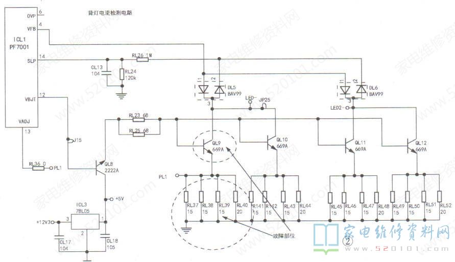从其电路分析,背灯电流控制电路是由背光驱动芯片ICL1(PF7001)和均流控制三极管QL9~QL12,以及过压检测双向二级管DL5、DL6和背灯过流检测电阻RL37~RL52组成。其中,ICL1的12脚为VBJT均流控制输出端,外接均流控制三极管QL8的基极,13脚为VADJ的LED电流设置输出,外接均流控制三极管QL9的发射极。而均流控制三极管QL9、QL10和QL11、QL12,分别组成LED1-、LED2-两支电流控制电路,其导通程度受QL8控制,由ICL1通过10脚输出的驱动脉冲电压和③脚设置的电压,对LED灯串电流电路实施控制,确保各路灯串电流大小相等,背光灯串发光均匀稳定,达到调整屏幕亮度和均衡度的目的。