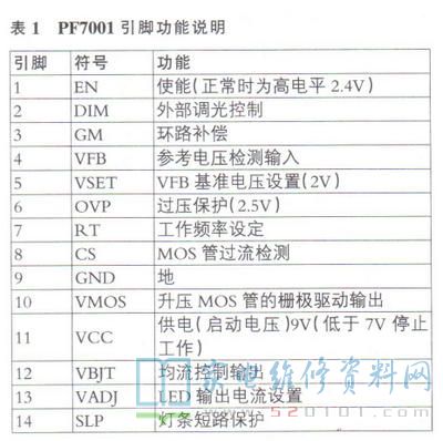 经过实际电路检测发现,背灯电流控制电路中的过流检测电阻RI37、RL39(15Ω)已变质,原以为更换之,故障可排除,然而,上机通电后故障依旧。仔细分析其原因得知:既然是过流检测电阻RL37、RL39有变质的情况,且均流检测三极管QL9也已击穿,那么可断定的是灯串短路造成过流引起。通过LED检测仪检查,发现其中一组的背光灯串确已短路,顺路再检测输出的正极性反馈电压经过双向二极管DL5送达ICL1的14脚,已超过设计参考电压值(0.5V )达1.2V,从而引起内部保护电路起控。最后,更换一路灯串和QL9、RL37、RL39,该二合一电源板上电输出背光驱动电压一切正常。PF7001 引脚功能见表1所示,故障部位如图2所示。