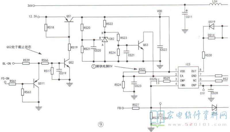 例2:一台LED32C3000型机(LPC42机芯),开机后黑屏,但声音正常。分析检修:开机,测量BL-ON信号电压正常,背光电路65V供电也正常,怀疑背光升压电路或灯条有问题。此机采用JCS30D-1MB191型电源二合一板,板上标注的LED+电压100V,但实测只有65V,严重偏低。检查背光控制芯片IC3的供电电路,如图9所示,发现IC3①脚( VDD )电压为0V,QS2基极电压为0.65V,集电极电压为12V,明显不对,判断QS2损坏。