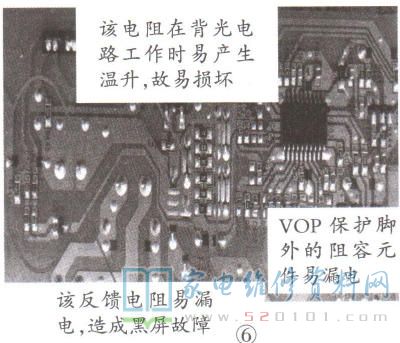 首先检查背光控制IC周围电路,未发现异常,转向检查升压电路,发现高压变压器旁边的电容C501已损坏。将C501换新后试机,故障排除。相关电路参见图5。