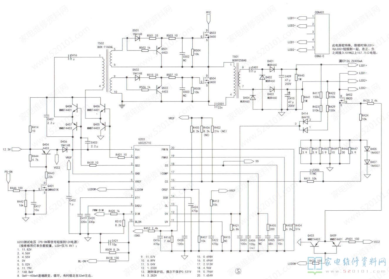 U203(UCC25710)是一款LLC桥式控制器,常用于多串LED控制电路中。二次开机后,开关电源中的PFC电路输出390.3V的PFC电压,供给背光驱动电路。同时,主芯片输出的PS-ON信号为高电平,Q401导通后Q404也导通,U203①脚(VCC)得到12V供电,BL-ON、PWRDIM信号分别经电阻R418、R420隔离后加到U203①脚⑨脚,U203开始工作,从②、③脚输出激励脉冲,经Q405~Q408激励放大后,从激励变压器T502⑤、⑥、⑨、10脚输出,经Q501、Q502再次放大后驱动开关管Q503.Q504,开关变压器T501的⑦-⑨绕组产生感应电压,经D401~D404全波整流和C409、C410滤波后,输出两组LED+电压,供给屏内两组LED灯条。