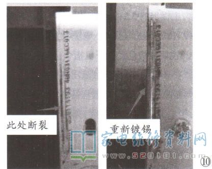 分析检修:开机,测量LED+电压,与板上标注一样,但LED-端电压约为0V,判断屏内灯条有问题。拆开液晶屏试机,发现灯条上的LED灯珠发光均很暗。逐一测量各组灯条的压降(正常值为12V),其中一组的压降为17V,怀疑此组灯条异常。试将该组灯条的正、负极短接,其他灯珠发光亮度恢复正常。检查该组灯条,发现LED灯串负极与最后一只灯珠之间的铜箔断裂,如图10所示。镀锡补焊后试机,故障排除。