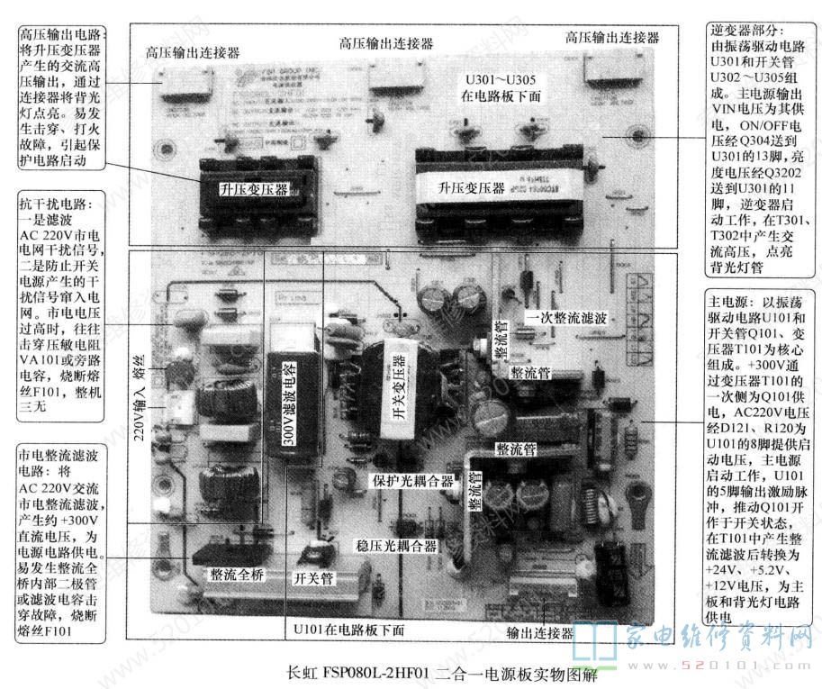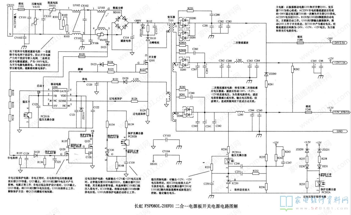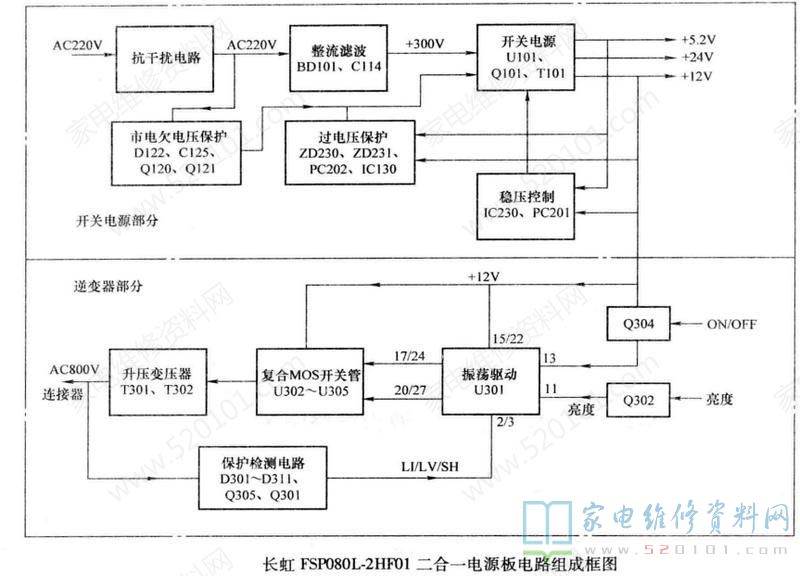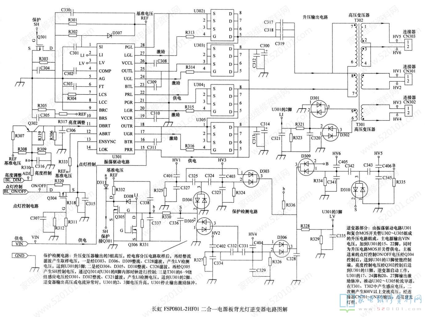 长虹FSP080L-2HF01二合一电源板在开关电源部分和背光灯逆变器部分均设有完善的保护电路: