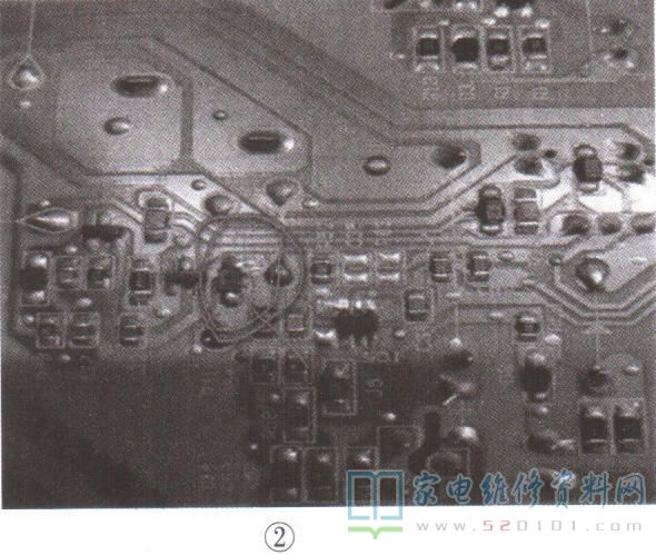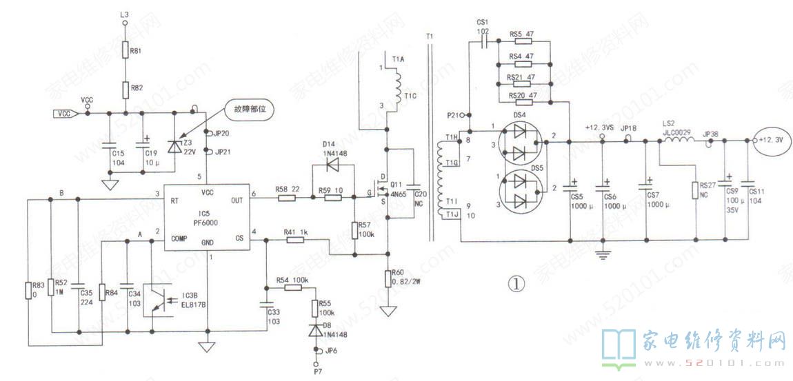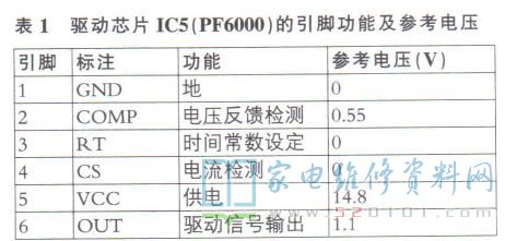 顺路检查,电源输出电压300V正常;PFC电压滤波电容C3两端电压为392V,也正常,初步可判断是12V电源电压形成电路工作异常引起的。由于12V电源电压形成电路是由驱动控制芯片IC5(PF6000)、驱动管Q11、开关变压器T1及周围元件组成,所以首先测量IC5的供电⑤脚(VCC),发现电压为6.7V左右(正常为14.8V),说明是其供电异常而引起12V电压无输出。进一步检查vcC电压形成电路,发现VDD电压输出为16V(开关变压器T1的⑤、⑥脚E、F绕组,经过电阻R6隔离,D11、C18整流滤波形成的VDD电压),而VCC电压却只有6.7V。于是先断开IC5的⑤脚测量,电压不变,怀疑是外围电路元件失效引起。最后检查发现稳压管Z3(22V )有轻微软击穿情况。更换Z3后,vCC电压恢复正常,故障排除。驱动芯片IC5( PF6000 )的引脚功能及参考电压如表1所示,故障部位电路如图1所示,实物如图2所示。