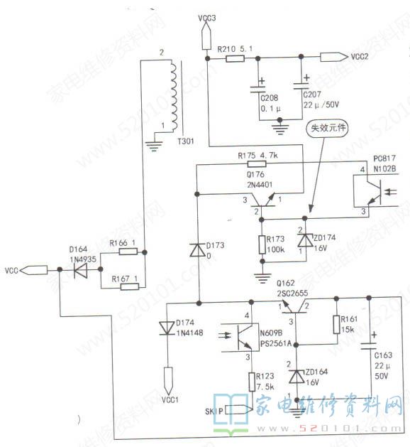 VCC3电压的形成则是开关变压器T301的①~②绕组产生感应电动势后,通过电阻R166、R167限流、二极管D164整流.电容C163滤波,产生17V电压,再通过三极管Q162.Q176放大控制而产生的。经过仔细排查,发现稳压二极管zD174(16V )软击穿,将其按新后,12V电压恢复正常,故障排除,故障部位电路如图1所示。