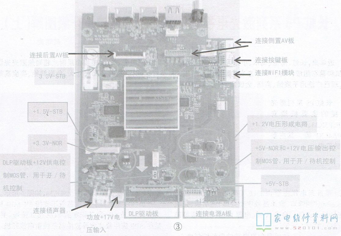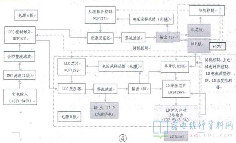 分析检修:此故障通常系电源A板无+12V电压输出所致,测试点为电源A板与机芯板的相连插座的+12V电压输出端,重点检查电源A板上的保险丝二极管及电源芯片NCP1271等元件。故障现象4:开机后,无图像,有声音,且风扇和色轮工作正常。分析检修:先检查电源B板上LD恒流驱动插座输出的两路约32V电压是否正常,如正常,则检查电源B板与DLP驱动板之间的通信电路。