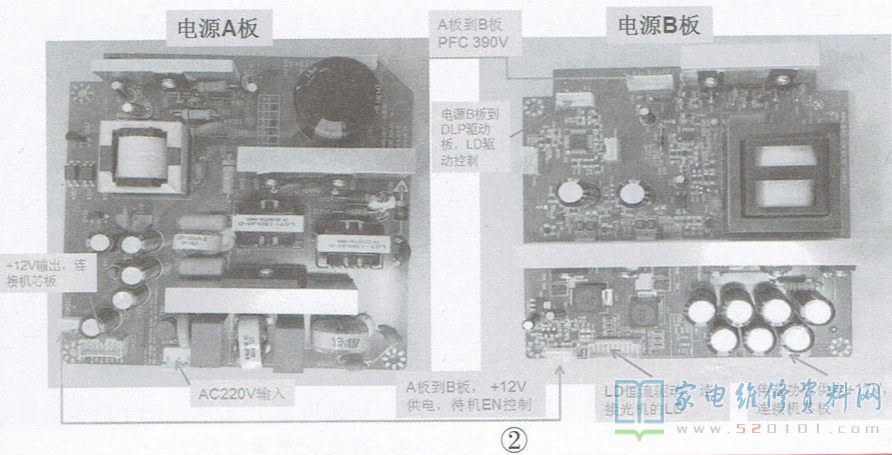 电源A板:输入AC220V,输出12V直流电压,供给机芯板和DLP板。同时输出PFC390V电压供给电源B板,如图2所示。