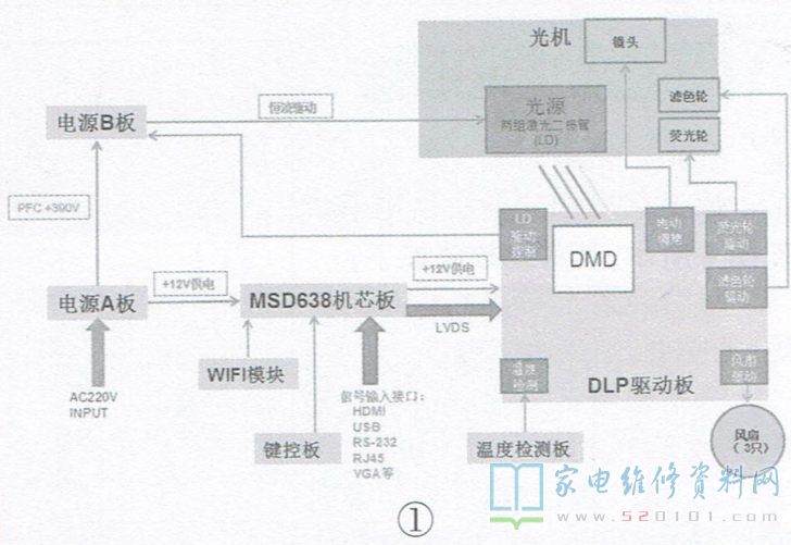 分析检修:先找到机芯板与DLP驱动板相连的LVDS线中的+12V供电线,测量该电压是否正常,如电压为0V,检查机芯板及DLP驱动板+12V供电控制电路;如果电压正常,则检查DLP驱动板。