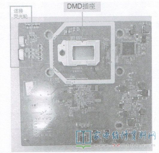 分析检修:此故障通常系DLP驱动板上的DDP4422、DDP4421损坏或DMD虚焊所致。实修时,可先取下DMD芯片再重新安装,若无效,则更换DDP4422、DDP4421。
