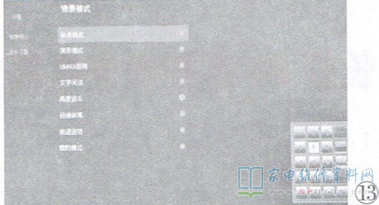 步骤6:本步进行参数配置。先进入设置菜单下的情景模式,然后按遥控器上的右键移动到“标准模式”,接着依次按“上、右、右”键,此时屏幕右下角会出现一个小键盘,如图13所示。