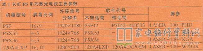 近年来,长虹、海信、海尔、小米等厂家先后推出了多款激光电视。该类电视由反射式超短焦激光光源投影机和幕布组成,可在0.5米左右的距离内投射出100英寸的画面,具有画面尺寸大、色彩鲜艳亮度高等优点,现已广泛用于展馆、商场、会议室、家庭等场所。长虹P5系列激光电视的主要机型有P5F、P5X33、P5X36、120A4LXP等,其主要参数见表1。