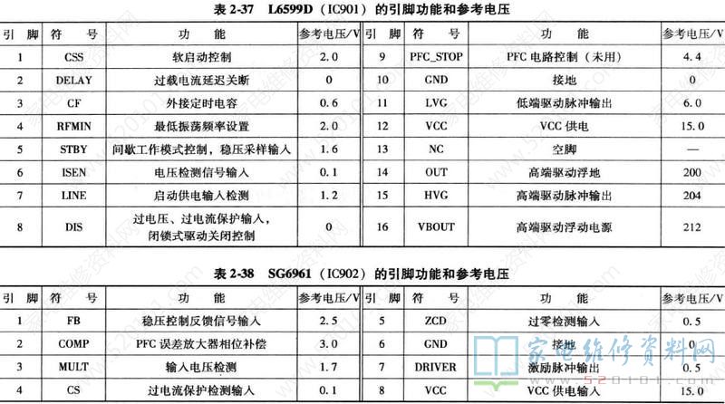 该电源板的集成电路引脚功能和参考电压见表1 ~表2。