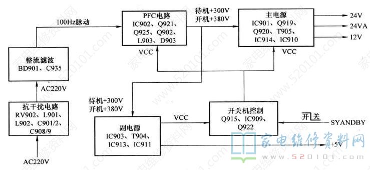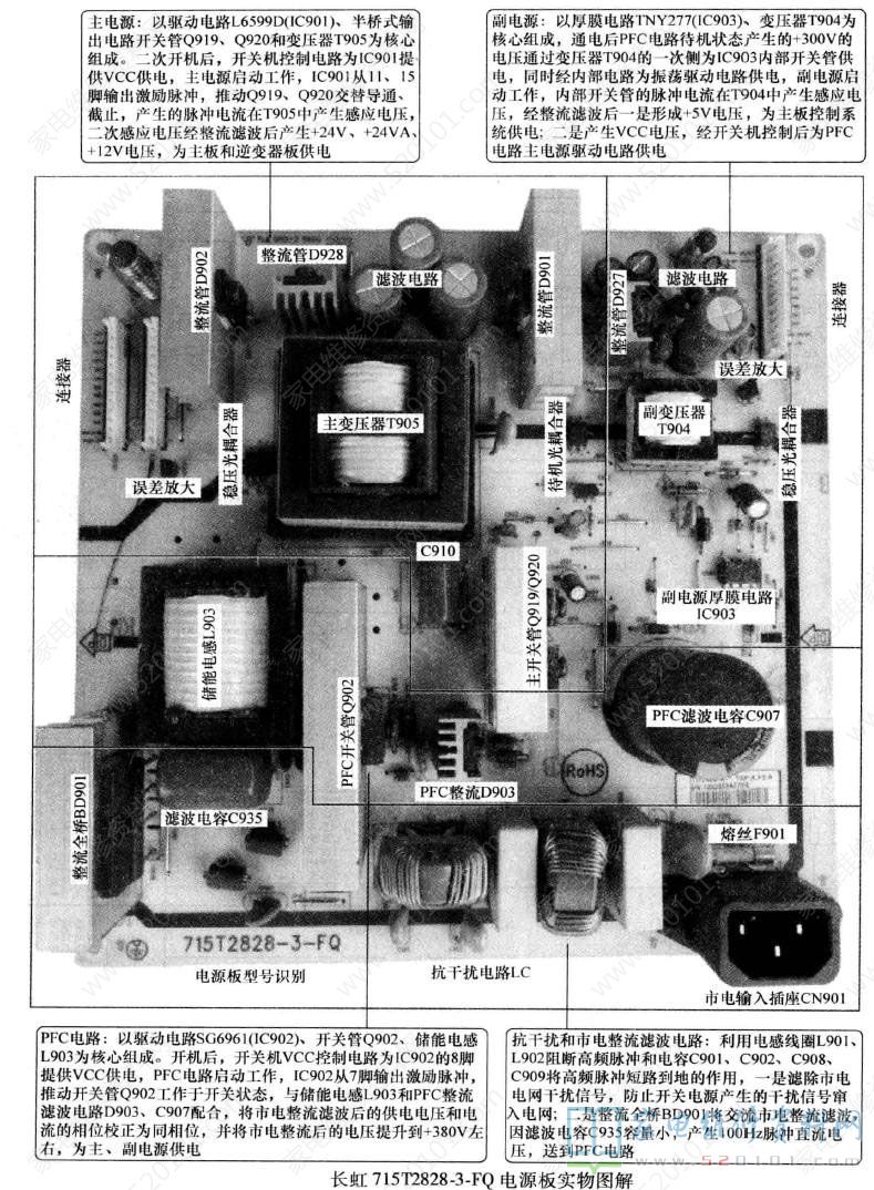 长虹715T2828-3-FQ电源板应用于早期的长虹LT42510FHT等型号液晶彩电中,它与715T2828-4-FQ电源板与其基本相同,可相互代换,其实物图解如图1所示;电路组成框图如图2所示。该电源板由三部分组成:一是以集成电路SG6961(IC902)为核心组成的PFC电路,将整流滤波后的市电校正后提升到400V为主、副开关电源供电。二是以集成电路TNY227 (IC903) 为核心组成的副开关电源,产生5V电压,为主板控制系统供电;产生VCC电压,经开关机电路控制后,为PFC驱动电路和主电源驱动电路供电。三是以集成电路L6599D ( IC901)为核心组成的主开关电源,产生24V、24VA、12V电压,为主板和逆变器板供电。开关机采用控制PFC电路IC902和主开关电源IC901驱动电路供电的方式。接通市电电源后副电源首先工作,产生VCC和+5V电压,其中+5V电压为控制系统提供电源,二次开机后开关机控制电路将vCC电压送到IC902和IC901驱动电路,PFC电路和主电源启动工作,为整机提供24V、24VA、12V电压,进人开机状态。该电源板还设有市电异常保护和VCC电压异常保护电路。当输人的AC220V市电或副电源输出的VCC电压异常时,保护电路启动,开关电源停止工作。