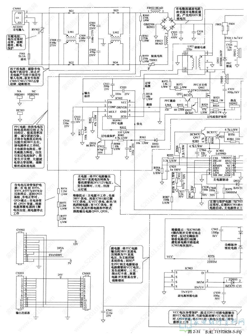 3. 脱机维修电源板断开输出连接器,将CN902的10脚与11脚短接,模拟开机高电平,在CN903的12V或24V输出端接假负载,单独对电源板进行维修。长虹715T2828-3-FQ电源板电路原理和维修图解如图3所示。
