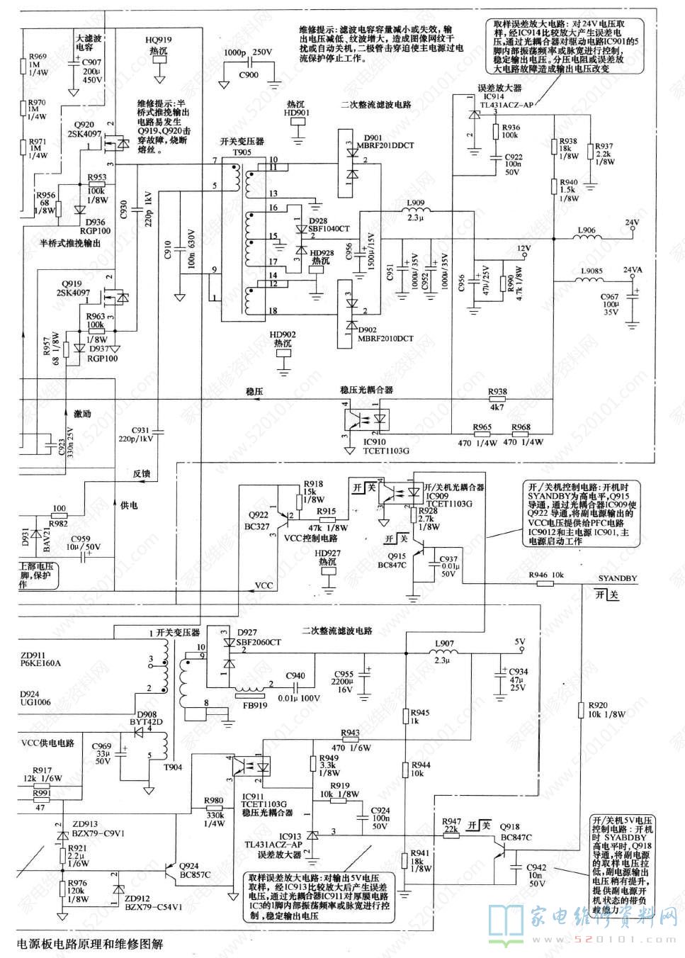 故障在主电源电路。一是检查PFC电路输出的400V电压是否正常,如果为300V,则是PFC电路未工作,先查IC902的8脚VCC供电是否正常,如果无VCC供电,则检查开关机控制电路;如果VCC供电正常,则检查IC902及其外围电路,查PFC整流滤波电路D903、c907 是否正常。如果400V和VCC电压正常,主电源仍无电压输出,查IC901及其外部电路,查Q919、Q920组成的半桥式推挽输出电路。