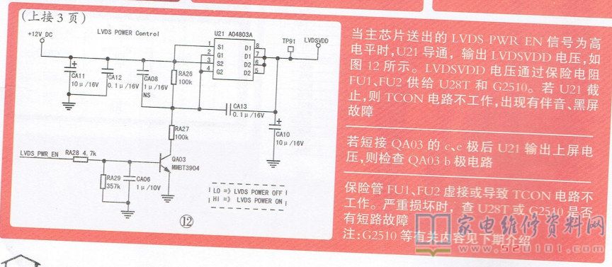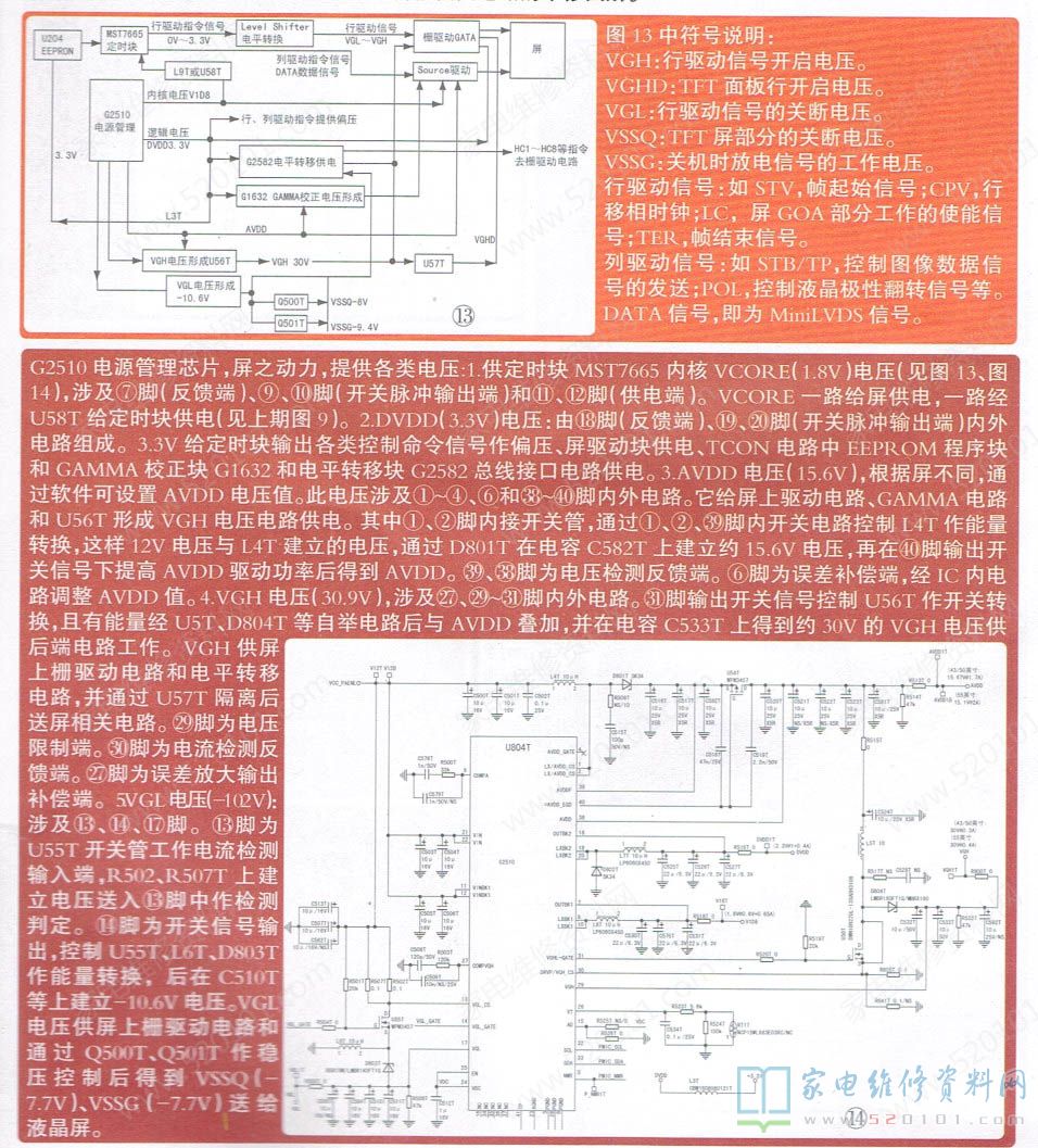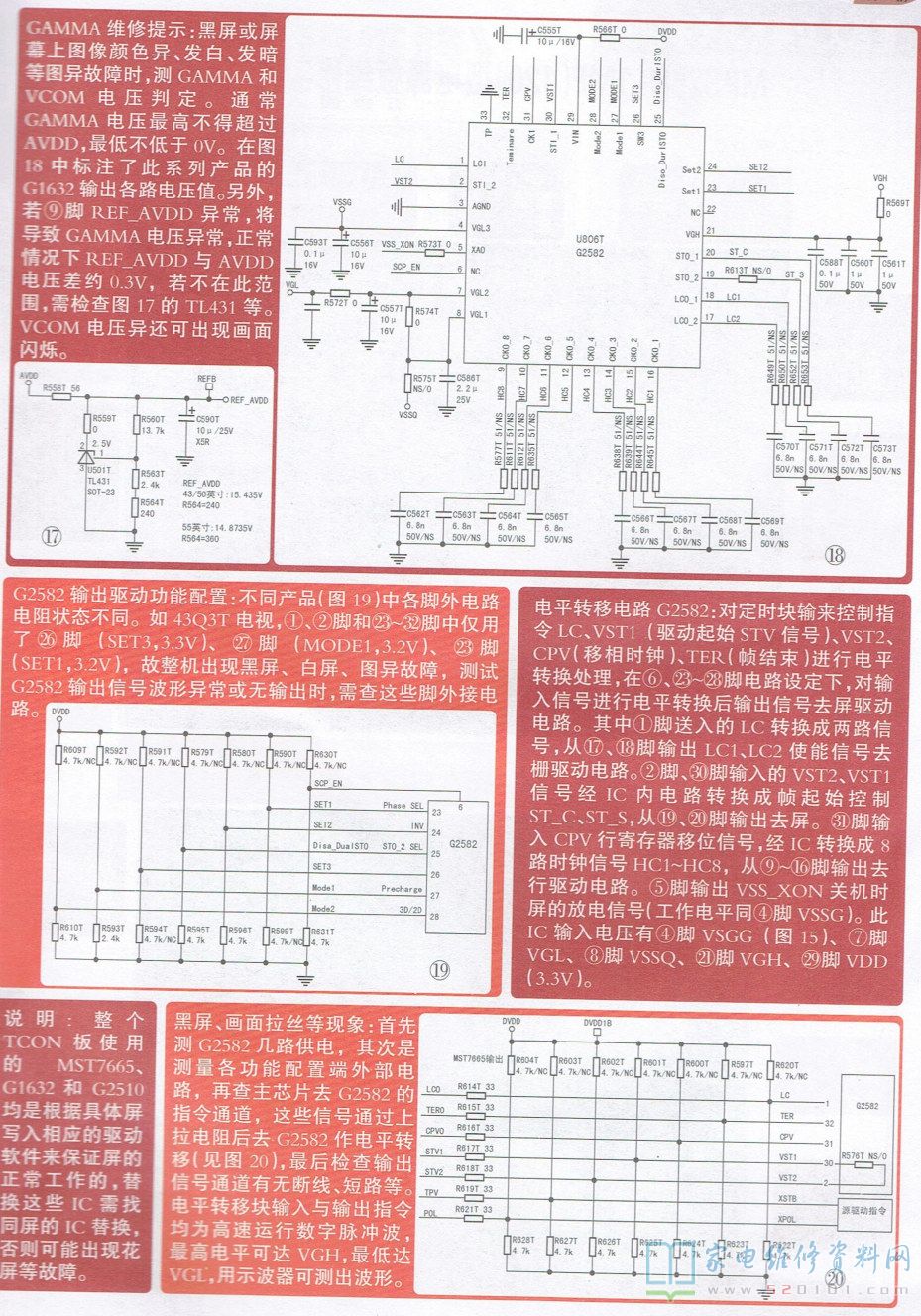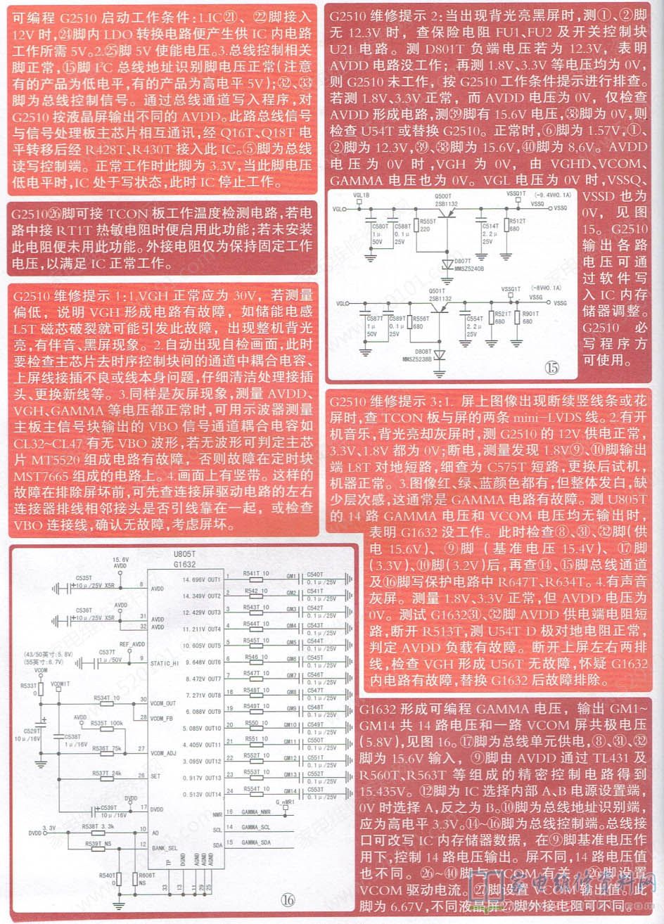 上面介绍了此系列产品TCON电路中的时序控制及相关供电等电路的维修图解,现在将继续介绍该TCON板上的电源管理块G2510( TCON的动力之源),它提供定时块、屏驱动电路和GAMMA电路、电平转移电路工作所需的电压,其关系见图13。图14、图15是G2510的维修图解。图16、图17是GAMMA块G1632的维修图解。图18~图20是电平转移相关电路的维修图解。