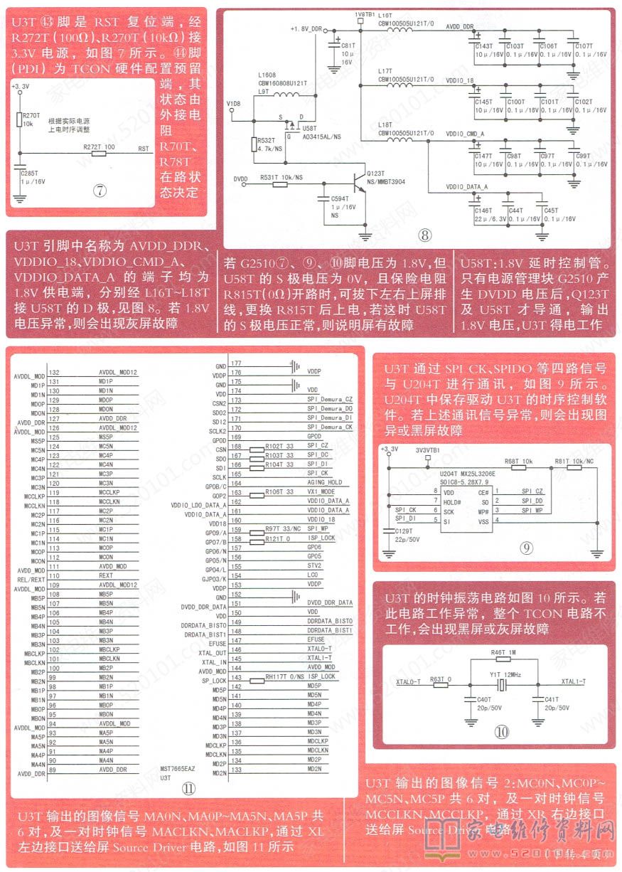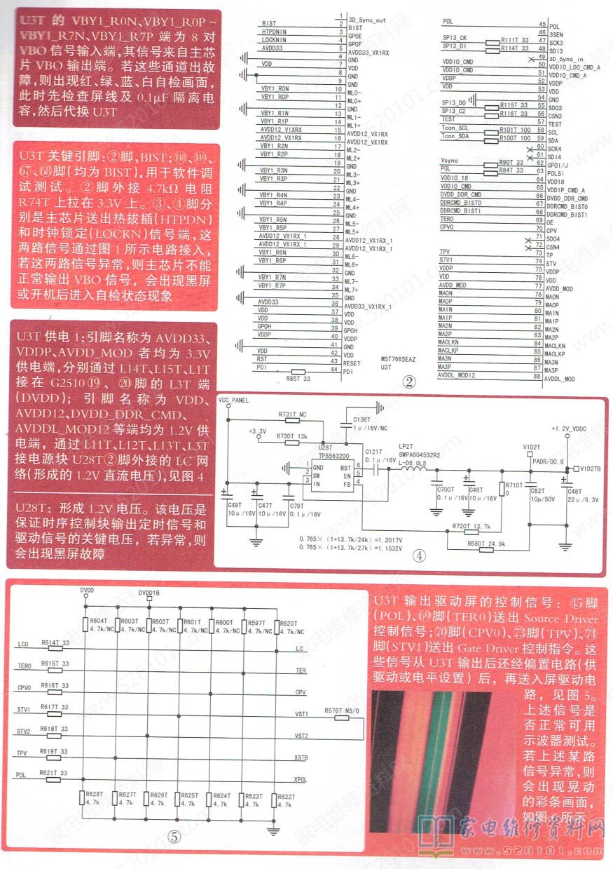 在长虹该类机型的TCON信号处理电路中,主芯片MT5520AEDJ(UM1)将数字信号转换成VBO编码信号,输往TCON时序控制电路,如图1所示。TCON定时控制芯片为MST7665EAZ(U3T),该芯片又称为图像处理控制器,需在软件下完成图像定时输出处理,左右输出各10对MINI_LVDS信号及多路时序控制信号去液晶屏行列驱动器。图2所示为时序控制块脚分布有关电路图。
