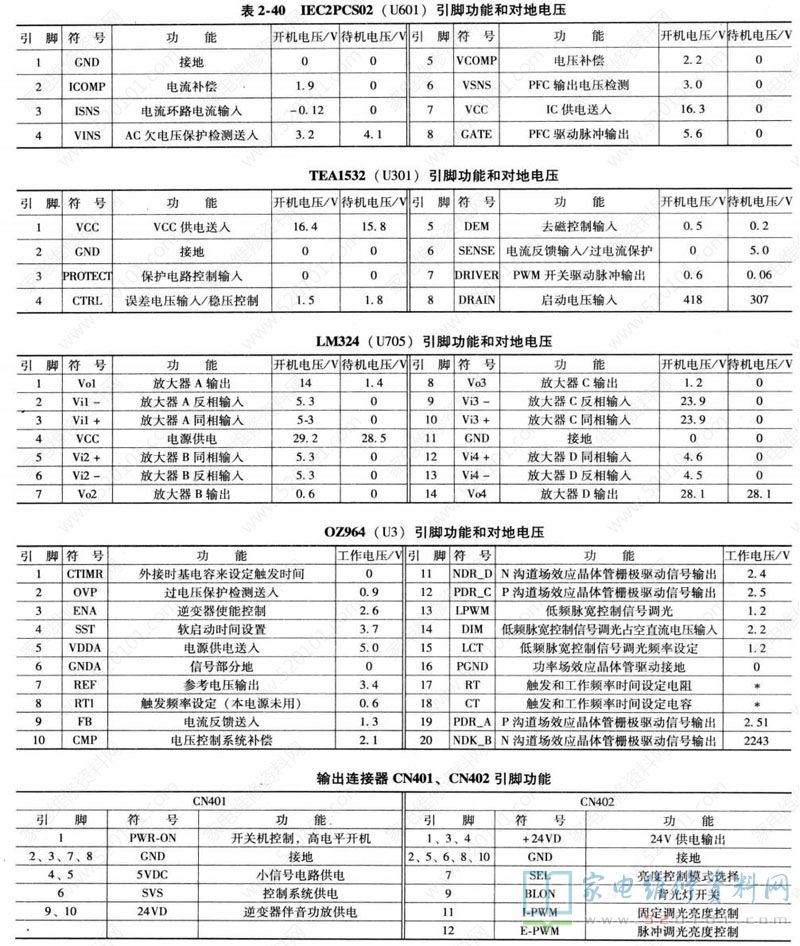 该电源板由三部分组成: 一是以IEC2PCS02 (U601) 为核心组成的PFC电路,输出+410V电压;二是以TEA1532 (U301) 为核心组成的主电源电路,为主电路板提供5VSTB、5VDC、 24V电压,其中sVSTB为主板控制系统供电,经开关机电路控制后的24V和5VDC电压为主板提供电源,同时24V再经主板转接后输出送回至电源板,提供给逆变部分使用;三是以OZ964(U3) 为核心组成的背光灯逆变器电路,输出8组高压分别提供给液晶屏内部8根灯管,灯管被点亮。开关机控制电路由MOSFET组成,控制主电源二次侧的24V、5V电压输出的方式,在待机状态下,副电源正常输出5VSTB,维持控制系统供电。该电源板还设有以集成电路LM324 (U705)为核心组成的过电流检测、过电压检测和过热检测保护电路,保护电路启动时,开关电源停止工作。该电源 板的集成电路引脚功能和对地电压见表1;输出连接器CN401、CN402引脚功能见表2。