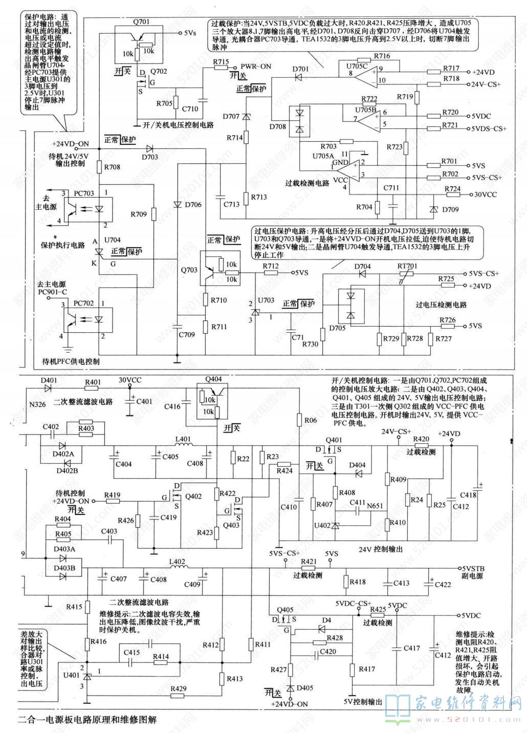 整流滤波后Q401的漏极24V正常、Q405 的漏极5V电压正常,而CN401无24VD和5VDC电压输出,故障在开关机控制电路。一是检查由Q701、Q702、PC702组成的控制电压放大电路;二是检查由Q401~405且成的24V、5V输出电压控制电路;三是检查由T301一次侧的Q302组成的VCC-PFC供电电压控制电路。