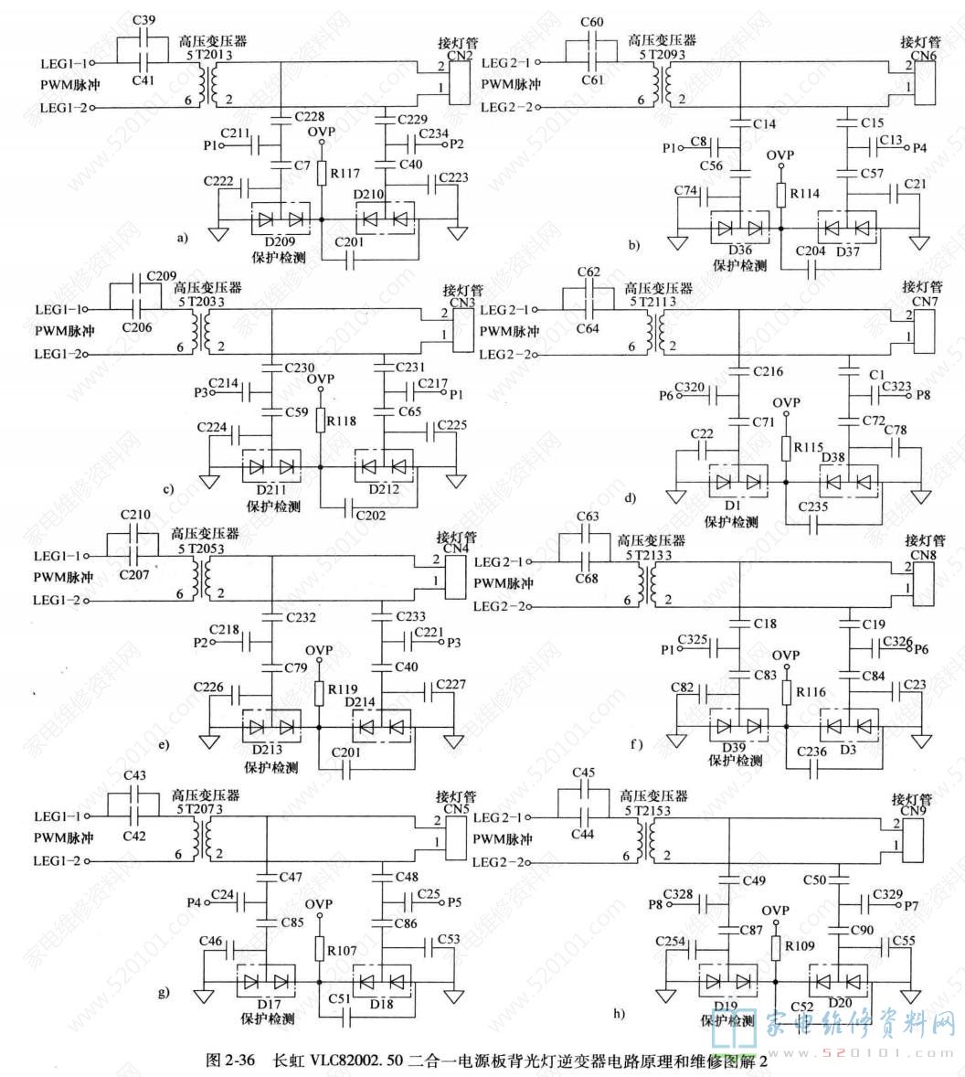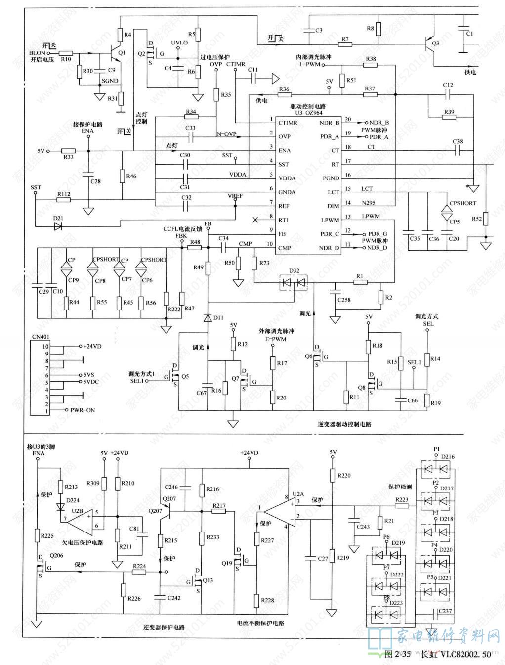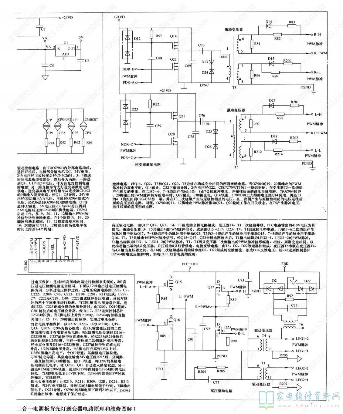 首先测量背光灯控制电路0Z964的11、12、 19、 20脚是否有激励脉冲输出,无脉冲输出,故障在背光灯控制电路,重点检查OZ964及其外部电路,将检测数据与表1的数据进行比对,判断故障所在,外围元器件正常时更换02964;如果有脉冲输出,重点检查激励电路和易发生故障的高压形成电路。长虹VLC82002.50二合一电源板电路原理和维修图解如图3所示;背光灯逆变器电路原理和维修图解如图4和图5所示。