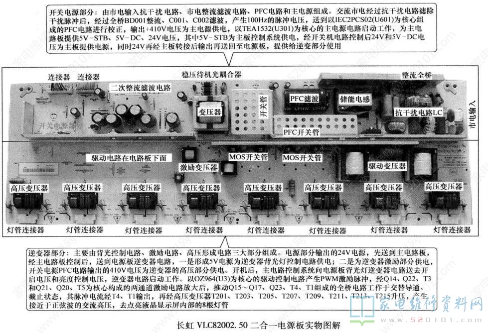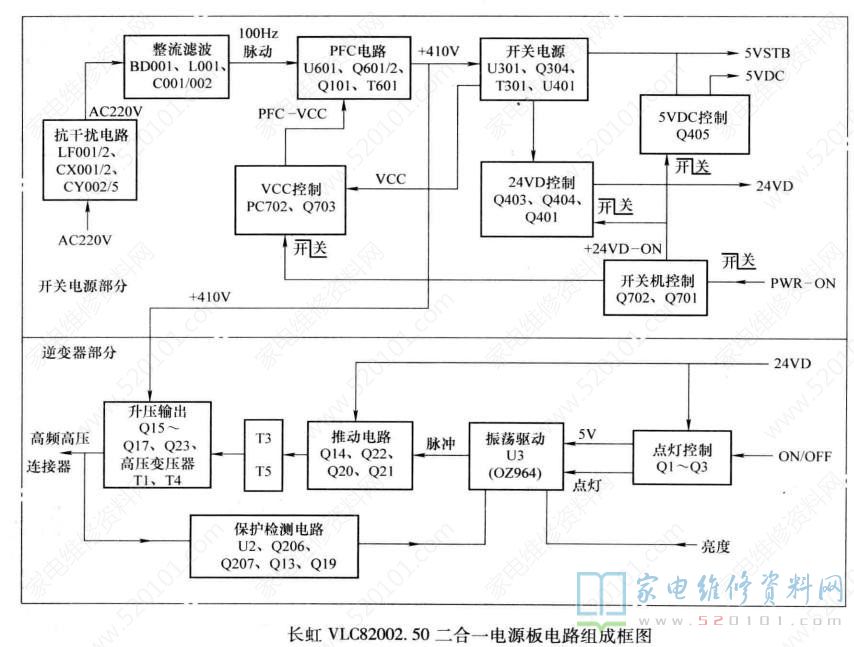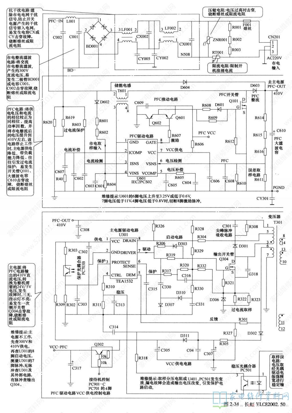 长虹VLC82002. 50二合-电源板引起的故障主要有三种:一是指示灯不亮, 多为电源部分故障;二是指示灯亮,无图无声,主要是电源+24V、+5V 供电电路故障;三是有声无光,则是背光灯逆变器故障。建议拔掉与主电路板的连接器,将电源板拆下维修:一是在 24V输出端接假负载;二是将连接器CN401的6脚5VSTB输出端与1脚PWP-ON开/待机控制端短接,模拟开机对电源部分电路进行检查。测连接器CN401的6脚输出的5VSTB电压是否正常,如果无5VSTB电压输出,则是电源部分故障;如果有电压输出,则是开关机控制电路或连接器故障。电源部分维修提示如下: