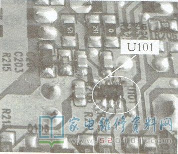 由此判断故障出在电源二合一板上。拆下12V滤波电容C332、C333(均为1000pF/25V)、C334(470pF)检测,正常;对开关电源初级电路进行检测,未发现异常:难道电源集走块U101(5AAROR,见图1)热稳定性差?将其换新后试机,故障排除。