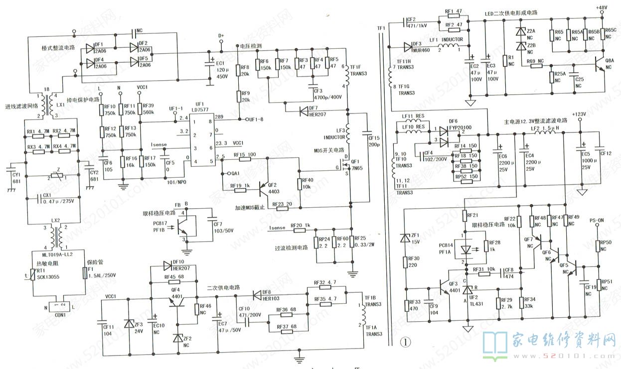 长虹MPS35D-1MC-220型电源二合一板主要用于长虹39英寸LED液晶彩电中,主要机型有LED39B1000C、LED39B31001C等。该板采用LD7577(UF1)作开关电源控制块,采用RT8525A(IC1)作背光电压形成和背光恒流控制芯片。UF1与开关管QF1、变压器TF1组成反激电源,输出背光电路工作所需48V电压和主板信号处理电路所需的12.3V电压,如图1所示。