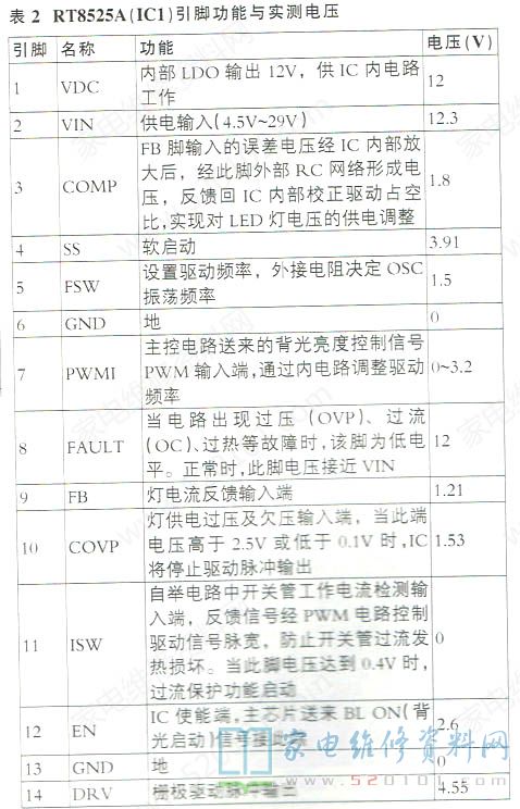 IC1 10脚外接取样电阻,对LED+电压分压。当10脚电压超过2.5V时,IC1判定灯串供电过压,此时逻辑电路停止驱动输出;当10脚电压低于0.1V时,保护电路也会启动,停止驱动输出。此时IC1⑧脚(FAULT)为低电平(正常工作时,⑧脚因通过RG9接vCC而呈高电平)。IC1 11脚外接开关管过流检测电路。QG1的工作电流在电阻RG21~RG24两端建立电压,并送入IC1 11脚,经IC内部消隐电路排除尖峰干扰后,送入误差放大电路中,调整驱动信号的脉宽,即改变LG1的储能时间,达到调整自举电路工作电流的目的。当11脚电压超过0.4V时,IC内OC保护电路将启动,⑧脚呈低电平,停止驱动输出。IC1引脚功能与实测电压见表2,供参考。