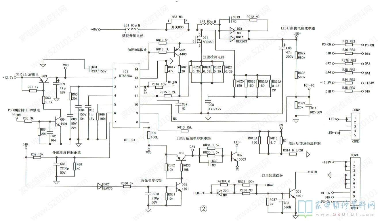 背光控制电路如图2所示。开关电源产生的12.3V通过RJ4送给QG3的e极,QG3受QG4控制。二次开机后,电源启动控制信号PS-ON为高电平,QG4饱和导通,QG3导通,12.3V通过QG3的e、c极接入IC1②脚。IC1内部12V的LDO调整器工作,输出稳定的12V电压供给IC内部振荡电路。振荡电路工作,从④脚输出栅极驱动信号,控制由QG1.LG1.DG1.EC8等元件组成的自举升压电路。LG1 端电压与48V叠加,在EC8两端建立的120V电压(LED+ )供给背光灯串。灯串工作后,从负极流出的电流通过QG7的c、e极,并在RG13.RG13A、R3两端形成电压。该电压经RG10送给IC1⑨脚,IC1据此电压通过PWM电路调整驱动脉冲占空比,以控制LED+电压,实现灯电流的恒流控制。同时,主芯片输来的DIM(背光亮度控制 )信号接入IC1 ⑦脚,IC1也通过内部PWM电路调整驱动频率,实现灯串电流控制。同时,DIM信号经DG2.CG10转换成变化电压,再通过QG5.QG6控制QG7的导通程度,进-步控制灯串电流。