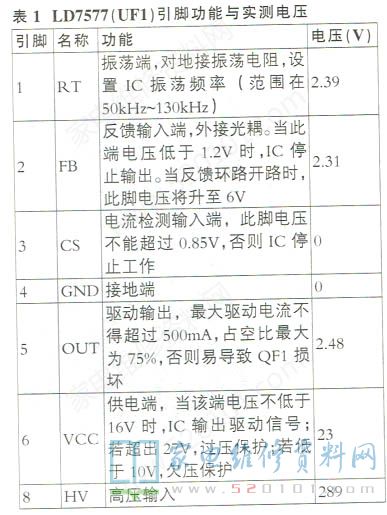 当UF1 ③脚电压达到0.85V时,将触发0C保护功能,停止输出驱动脉冲。QF3为12.3V 过压检测管。当12.3V过高时,ZF1击穿,QF3饱和导通,PF1因②脚被瞬间拉低而饱和,UF1②脚电压为0V,PF1停止工作。UF1引脚功能与实测电压见表1,供参考。