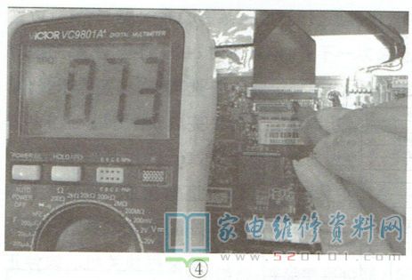 分析检修:首先检测CP334.Q501和U51输出的12V,都正常,但LVDS信号的一路时钟信号(上屏插座①脚RXEC- )只有0.73V电压(各路上屏差分信号正常值均为2.15V左右),偏低,如图4所示。