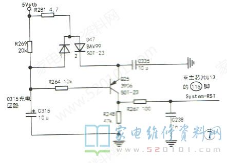 复位电路工作原理:如图7所示,上电时,5Vstb电压通过双向二极管D47(正向)给三极管Q25(3906 )发射极提供正偏电压,其基极经电阻R269、R264提供低电平,此时Q25导通并从集电极输出复位电压,即在刚开机时,主芯片是通过高电平进行复位,然后处于低电平工作状态。复位电流流向:5Vstb->R281->D47 ( 正向正端)->Q25(e 极)->Q25 (c极)->高电平System-RST复位信号,同时因Q25导通,给电容C315进行充电;关机时,C315开始放电一D47 (反向正端)-5Vstb(oV)。另外,R267、C238组成RC低通滤波电路,可有效消除供电电压不稳造成的复位误动作;而双向二极管D47-方面可减少电压波动造成的复位误动作,另一方面在系统断电时,可将R269 电阻短路,让电容C315快速放电,等下一次来电时,能产生有效的高电平进行复位。所以,复位电路中的任何元件损坏,均会使复位电路出现异常。