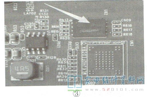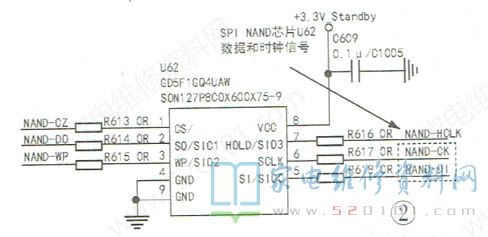 分析检修:经测量,CP334的12V电压、上屏电压控制电路Q501.U51形成的12V供电,都正常。检测主芯片输出的上屏差分信号,没有波形输出,电压偏低,怀疑主芯片工作异常。再次通电二次开机,发现电源指示灯没有闪烁,判定主芯片没有工作。重点检查主芯片U61(TSUMV69YU)的90、96、102脚(VDDC )供电,为正常的3.3V,但94脚(NAND_ DI )数据信号和⑨脚(SPINAND_ CK)时钟信号的电压均为1.7V左右偏低。U61的91脚、94脚信号来自SPINAND芯片U62(GD5FIGQ4UAW)的⑤脚、⑥脚,并与之进行数据、时钟信号的通信传输。若U62的数据时钟信号失效,必然会影响U61的正常工作。于是,检查U61⑧脚供电为正常的3.3V,因此判断U62已损坏。更换U62后,重新写程序,二次开机图声正常,故障排除。相关电路及实物图如图1~图3所示