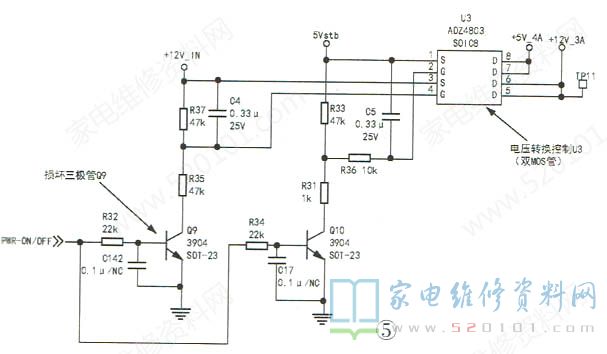 通过实际电路检测,U3的④脚电压为12V高电平,异常,则U3不能正常输出12V 3A电压。如图5所示,查U3的④脚外接电路,发现Q9的基极电压为3.1V,集电极电压为12V(正常时,Q9应该饱和导通,集电极应为低电平0V左右),怀疑Q9损坏。取下Q9检测,已开路。换新Q9后试机,12V 3A供电恢复正常,故障排除。