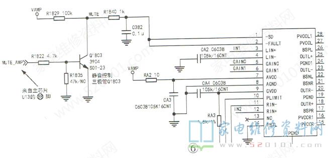 提示:在实际检修无伴音故障时,需对电路图和实际的电路板认真比对检查,除了检查伴音功放的供电外,还须检查静音控制电路是否处于正常状态(正常情况下,MUTE AMP为低电平,控制三极管Q1803截止),如图6所示。