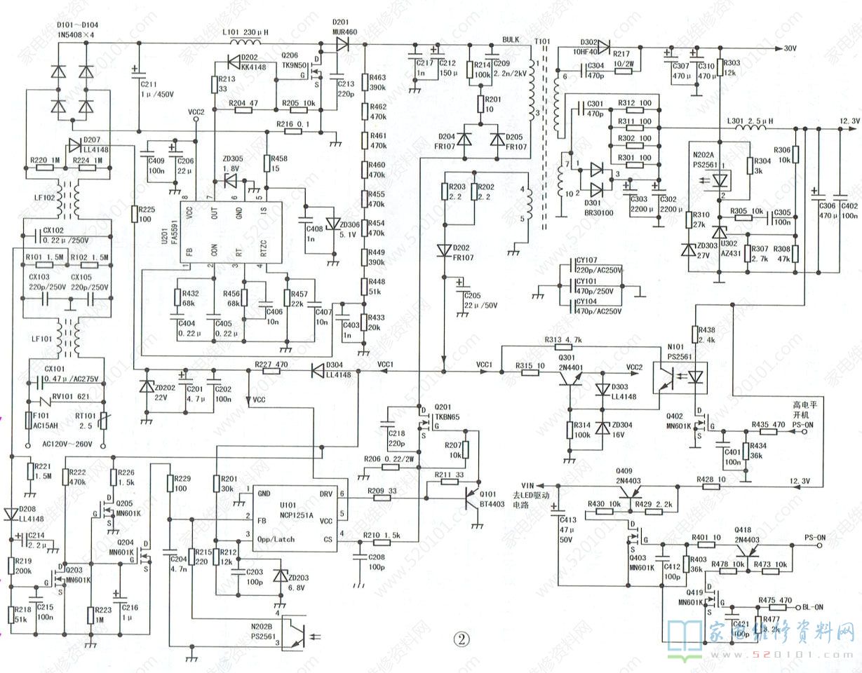在PFC电路工作之前,PWM电源已率先工作,其过程如下:从抗干扰电阻R220.R224的连接点取出的市电电压经D207整流R225限流及c201.C202滤波后,得到约17V的启动电源,送至U101(NCP1251A )的电源端⑤脚,U101内部的振荡器、脉宽调制器工作,产生的开关激励脉冲经⑥脚输出,使开关管Q201工作于开关状态。C209、R214、R201、D204、D205组成高压吸收电路,防止开关管Q201在截止期间被T101初级绕组感应出的反峰高压击穿。