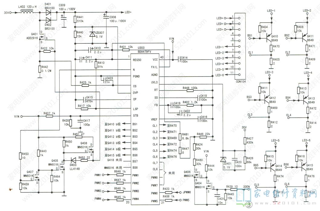 当LED灯串电流增大时,Q410~Q415的c极输出电压升高,即U303电流反馈端32~27脚的电压升高->U303⑨~14脚电平升高- >Q410~Q415 导通程度变浅->LED灯串电流变小,达到恒流控制的目的。