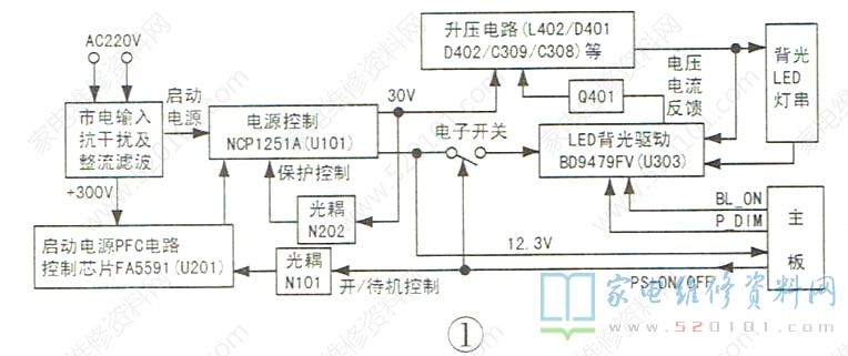 长虹HSM35D-6M6型二合一板(电源+LED驱动)广泛用于长虹液晶彩电中,其框图如图1所示。该板主要由市电输入抗干扰及整流滤波电路、PFC电路(控制芯片:FA5591)、PWM控制电路(控制芯片:NCP1251A)、背光LED驱动电路(控制芯片:BD9479FV)、反馈、保护及开/待机控制等电路组成,开关电源输出12.3V 和30V电压。