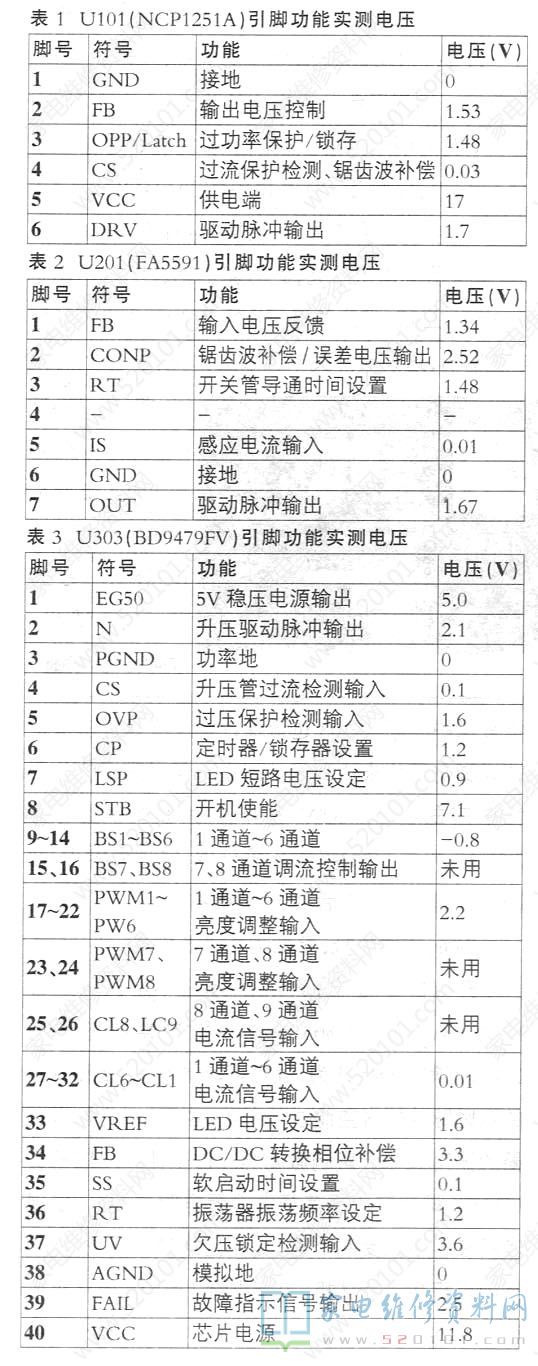 LED驱动电路输出过流保护:若LED驱动电路输出过流,R442两端电压将上升,当U303过流保护端④脚电压升到0.5V时,U303内部过流保护电路动作,U303②脚无激励脉冲输出,开关管Q401停止工作。同时,U303⑨~④脚输出高电平,6只调流管同时截止,LED电路进入保护状态。当LED+电压大幅下降,U303⑤脚过压保护端电压低于0.1V时,U303内部的过载保护电路动作,同时U303⑨~④脚输出高电平,LED电路进入保护状态。为了便于实修时参考,特附上U101、U201、U303的引脚功能与实测电压,见表1~表3。