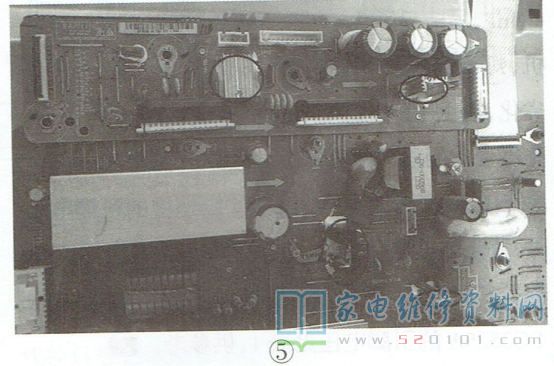 处理好屏打火故障后,再次对Y、Z板进行在路电阻测量检查,除上述5只功率管损坏处未见其他元件损坏。由于这几只功率元件要求较高,因此建议选用拆机件慎用全新件 。更换上述损坏元件后试机,故障排除。长时间试机后,发现Y、Z板上几只功率元件温度较高,为保证电视机的可靠性,给这几只元件加装了散热片,如图5圆圈内所示。