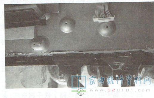 用附送的注射器针头将其均匀涂抹到焊了细铜丝的电缆线上。须注意的是,不要把银浆涂到屏玻璃切面上,否则会造成屏线、玻璃、底板之间短路。涂好银浆并检查无误后,用吹风机对电缆线进行加热固化。开始加热时,新涂的银浆会流动,渗透到裸铜线与屏线的缝隙中。加热约10min,基本上就固化好了。冷却后再次检查屏线、裸铜线上的银浆痕迹,确保没有流到屏玻璃上。所以需用704硅橡胶挤进屏玻璃与底板之间,以阻止银离子移动,如图4所示。