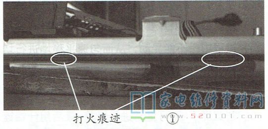 拆下显示屏组件,将其屏面朝下放到工作台上。取下z板后,用手轻轻按压两根独芯电缆,并用手电筒照射独芯电缆根部处的玻璃,发现有两处因电弧打火而留下的银白色痕迹,如图1所示。正是这两处电弧打火,造成Y、Z板上多只元件击穿。分析认为,此屏打火的原因主要有以下两点:-是面板设计欠佳 ,电极间距离过小,正常 工作时屏线与底板之间脉冲电压达到几百伏,在空气潮湿或有灰尘情况下打火在所难免;二是屏线导电镀层截面偏小,屏工作时电压高、电流大、温升快,导致屏引线镀层表面氧化,电阻增加,导电能力下降,从而引起电路打火并烧断导电镀层。找到屏打火位置后,用记号笔在屏底板边框处标记出切割范围,如图2所示。切割的长度宣大不宜小,但宽度一定要控制好,约10mm内,不能伤及显示屏玻璃,否则,会损坏显示屏面板。