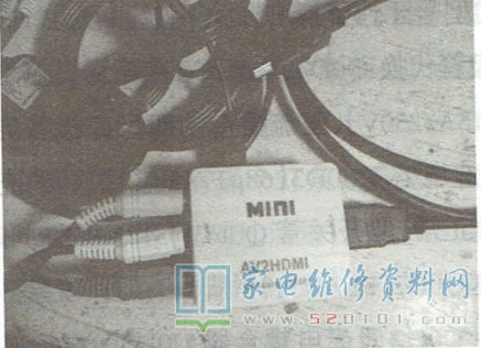 由此判断,该机AV输入电路损坏。顺着AV信号输入电路检查,发现主芯片U1外围3只微型贴片元件有被雷击损坏痕迹。因不知这3只元件的类型与参数,所以无法元件级维修,购回一只AV信号转HDMI信号的小盒,外接5V电源(可用手机充电器)试机,如图1所示,图像、声音均正常。