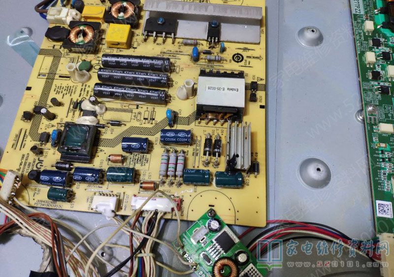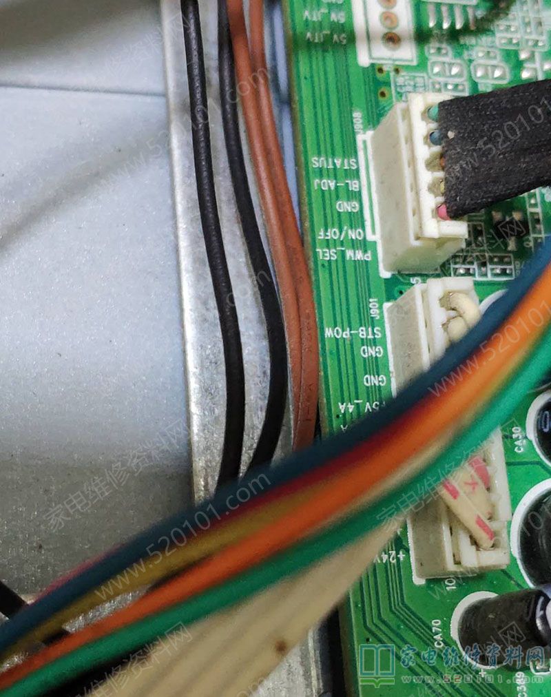 接修一台长虹LT32630X液晶电视,由于原机电源板雷击损坏,前一任维修工就网购了一块电源板,原机电源板是高压板和电源板一体的,网购的改装版是电源板和高压板分离的代用板,这次代用板又被雷击坏了。这次是电源板损坏了,由于电源板修复难度大,于是想用别的电源板代用。现在门市的费电视机多了,原机主板需要24V和5V电源待机5V电源,于是找出一个海尔电源板(只要24V功率够),这个电源板没有5V只有12V,于是将12V加一个12V转5V的稳压器,这样改好后开机电视机起初工作都正常,不过工作一会后电视机就待机了,开先以为电源功率不够,不过发现开机过后这些电压没有下降一点点,结果分析主板插件如下图所示,其中有个STATUS,这是一个代表电源工作是否正常的标志,开机他是高电平,当24V电源正常工作后就会变成低电平,于是看原来电源改的方法,原来电源是将这个线直接接入3K电阻强制到地,于是将这根绿色线通过3K电阻接地,电视机改制成功。