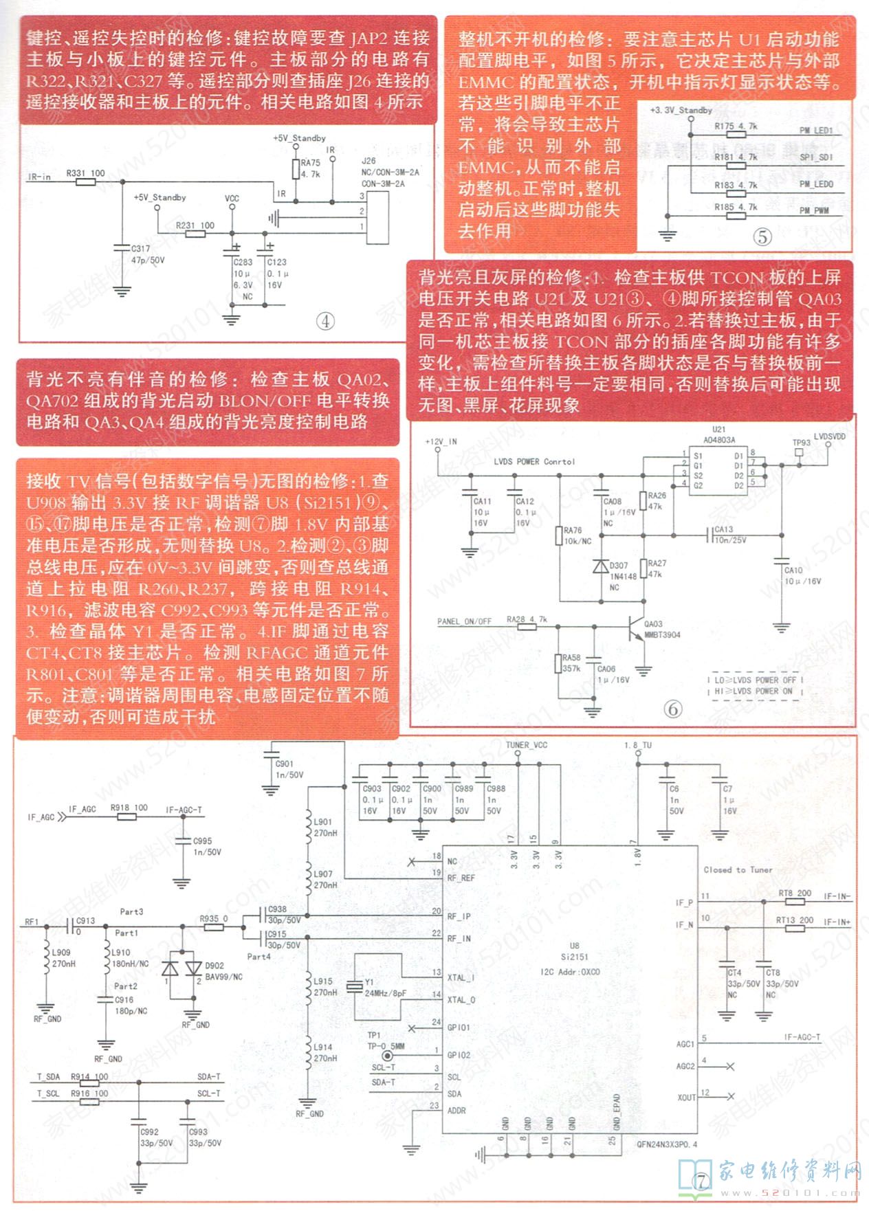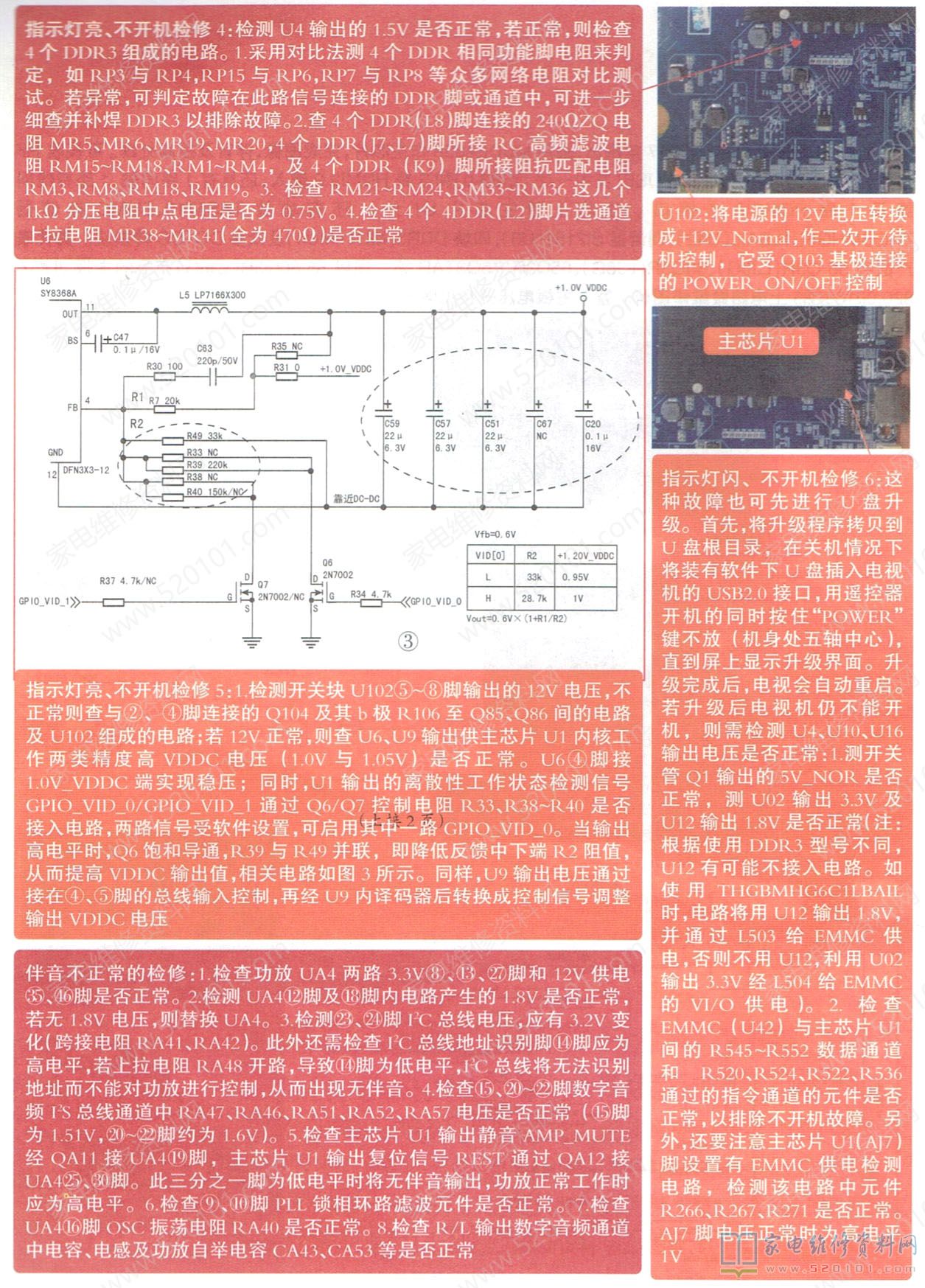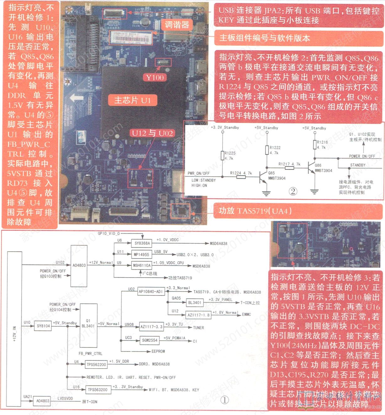 长虹ZLS70HI机芯于2017年推出的产品,它采用MSD6A838作主芯片,完成图像、伴音及控制处理。可接收RF信号,具有1路AV输入、3路USB(其中一路 USB3.0)和3路HDMI2.0输入,还具有1路同轴、1路有线网络及1路PCMCIA卡接口。主板上除主芯片U1外,还有功放TAS5719.EMMC存储器THGBMHG6C1LBAIL(U42 )、调谐器Si2151(UB)、四块DDR3(MU1-MU4)及众多DC .DC转换块。其代表产品有长虹55Q3R(LW6G )、60Q3R(LJ6G )、65Q3R、75Q3TAR等。现以55/60Q3R(LJ6G)产品的主板JUC7.820.00166285上电路做维修图解。整个主板电压分布见图1。