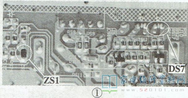 接修一台长虹49D3000iD 型液晶彩电(ZLM61H-i机芯),热机后自动关机。在故障出现时,测得12V待机电压正常,但电源板(型号:JCM50D-MM (-5)430)上的PFC电压只有308V,即PFC电路未工作,怀疑电源进入了保护状态。测量保护控制三极管QS2的基极电压为0.7V,由此确认电路进入了保护状态。断开保护电路中的二极管DS7试机,图像、声音均正常,看来故障系保护电路误动作所致。根据经验,判断保护电路中的二极管DS7、ZS1热机漏电,如图1所示。更换这两只二极管后试机,故障排除。
