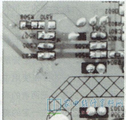 接修一台长虹55G6型彩电(ZLS58GiH机芯),有时能开机,有时不能开机,并且开机后也会无规律自动关机。根据经验,二次开机困难的故障原因主要有两点:一是主板复位、程序或供电异常,二是电源板输出电压异常。通电试机,并将信号源切换至HDMI模式,约半小时后电视自动关机,指示灯亮。此时测量电源板输出的12V电压只有10.5V,怀疑电源板(型号:HSL55D-1SH 560)有问题。断开电源板与主板的连线单独测量,电源板12V输出电压仍只有10.5V, 由此判断故障部位在电源板上。12V输出电压低的原因主要有以下三点:一是输出电压取样电阻漏电,或者三端精密稳压器TL431性能变差;二是开关电源初级的二次启动供电(串联稳压)异常;三是驱动电路或者负载异常。本着先易后难的原理,先检查输出电压取样电阻,如图1所示,发现铜箔面有受潮现象。用吹风机烘干此部分线路后试机,12V电压恢复正常。装机试验,故障排除。