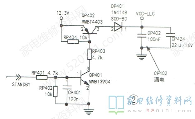 但是,在实测过程中,发现UP401的①脚只有8.9V,那会不会是UP401内部短路造成的电压偏低呢?于是断开UP401的①脚,再测量其电压仍然如此,故排除UP401内部短路引起电压偏低的情况。既然排除了背光驱动芯片因素,那么问题肯定就出在VCC-LLC的控制产生电路当中。由于12V供电测试有8.9V左右,说明三极管QP401、QP402的控制应该没有问题,重点检查周围电路元件有无变质或漏电。最后,通过断开滤波电容CP402 (100nF) 后,再次测量12V (vCC-LlC )供电已恢复正常。取下CP402检测发现有轻微漏电,说明12V偏低的确是CP402漏电引起。将其更换后故障排除。故障部位电路如图2所示。