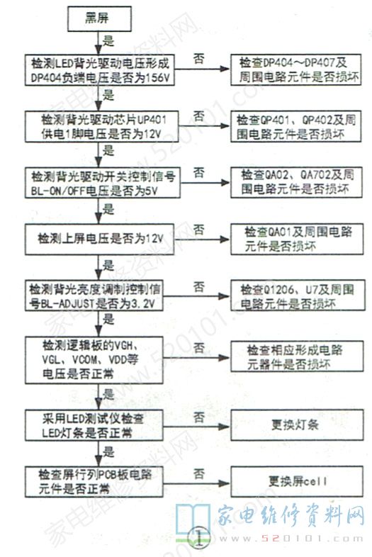 一台长虹49A1U型(三合一机芯:ZLS58G-iP)智能彩电,黑屏。该型智能彩电黑屏故障检修思路如下,检修流程图如图1所示。(1 )检查背光驱动电路输出的LED驱动电压是否正常;(2)检查背光驱动开关控制信号BL-ON/OFF是否为高电平;(3) 检查背光亮度调制控制信号BL-AD-JUST是否正常;(4)检查上屏电压是否正常;(5 )检查逻辑板是否工作异常;(6)检查LED背光源(灯条/灯珠)是否开路;(7)检查屏行列PCB板电路或液晶屏cell是否损坏。